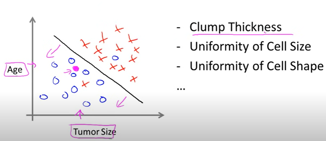 O는 종양 크기에 따른 나이를 의미하고, X는악성으로 판정 받은 종양을 의미하고 학습한 결과 직선이 양성 종양, 음성 종양을 판별하는 기준이다. 따라서 분홍색 동그라미에 해당하는 환자는 음성 종양을 가질 것이라는 판단할 것이다.