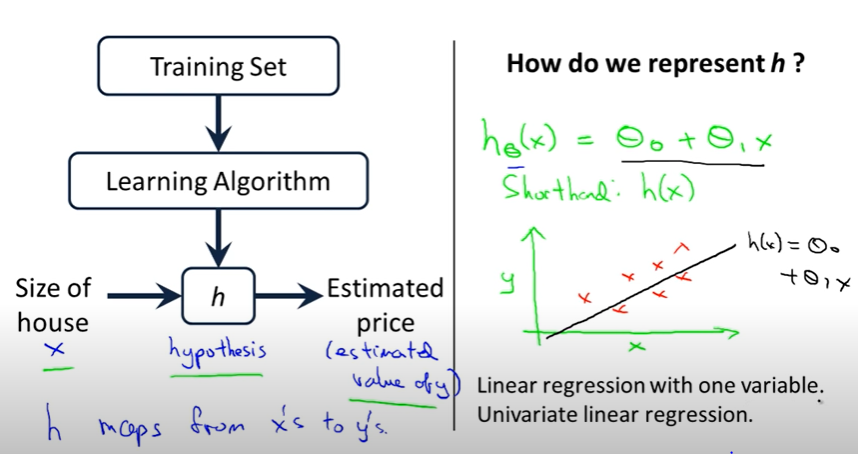 h는 "How do we present h?"에 적혀있는 수식대로 표현 가능하고, 이 함수의 경우 Linear 형태의 값을 예측한다. 이를 우리는 Linear regression with one variable 또는 Univariate linear regression이라고 한다. Univariate는 One variable을 의미한다.
