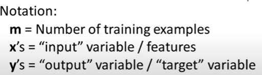 m = 47개, x는 Size in feet^2, y는 Price in 1000's를 의미하고 (x, y)는 하나의 training 사례이다.
