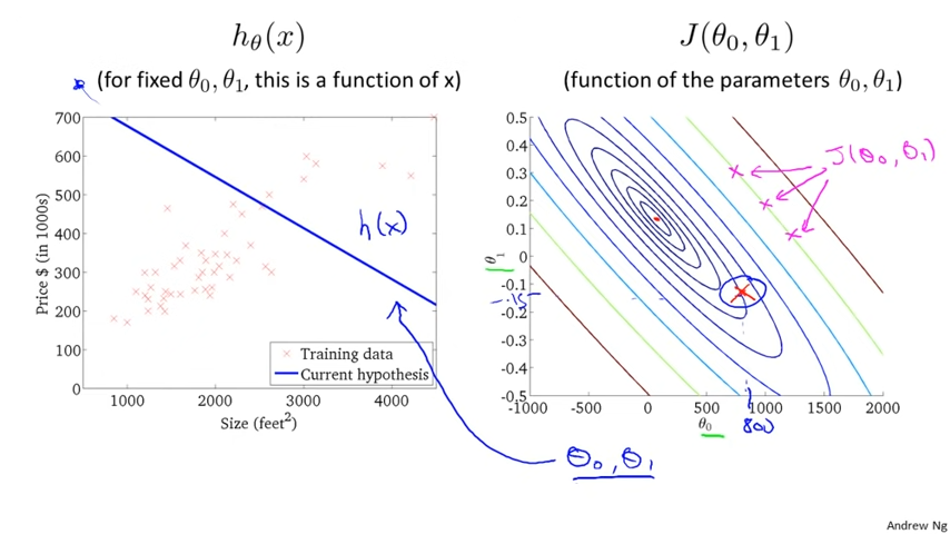 theta 0과 theta 1에 따라 h(x)가 달라진다. 위 3가지 h는 theta에 따른 값의 분포를 보여준다.